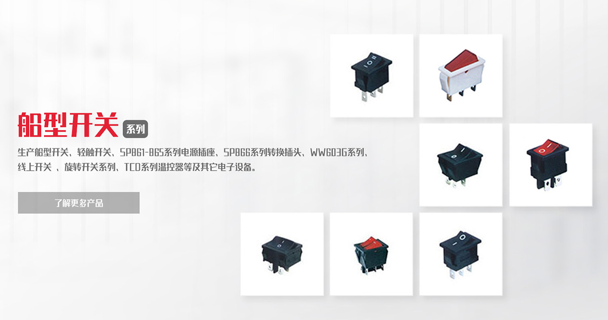 公司專(zhuān)業(yè)生產(chǎn)船型開(kāi)關(guān)、輕觸開(kāi)關(guān)、SP861-865系列電源插座、SP866系列轉(zhuǎn)換插頭、WW11系列微動(dòng)開(kāi)關(guān)、WW01-03、09系列按鈕開(kāi)關(guān)DS、WW系列指示燈開(kāi)關(guān)、WW603G系列 線(xiàn)上開(kāi)關(guān) 、旋轉(zhuǎn)開(kāi)關(guān)系列、TCD系列溫控器等及其它電子設(shè)備。